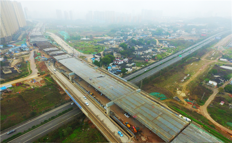 3月22日,长沙市新建的湘府路高架桥跨越京港澳高速。21日,湘府路快速化改造工程主线高架香月路至京港澳高速段完成预制钢板组合梁架设,实现主体贯通。工程开始转入桥面铺装及附属结构施工阶段,预计5月底完工。湖南日报记者 田超 摄