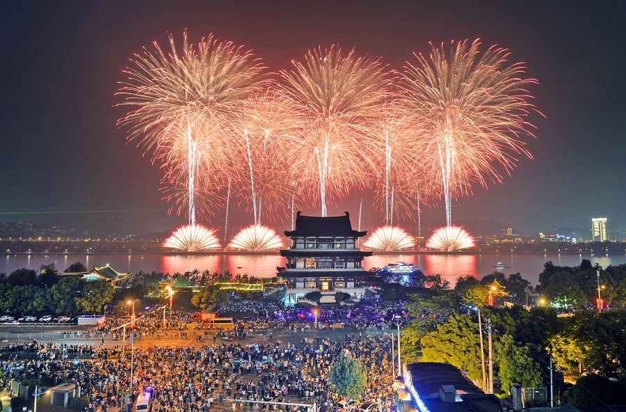 由焰火打造的“金色瀑布”,展现航天中银河万里的辉煌气势,与湘江之中约五公里长的橘子洲相互呼应;动态翅膀的焰火造型,象征着我国航天事业振翅高飞、继往开来。同时,飞碟、火箭等创意焰火,致敬默默无闻、甘于奉献的航天幕后工作者……各种焰火造型,不同表现形态,让市民目不暇接。