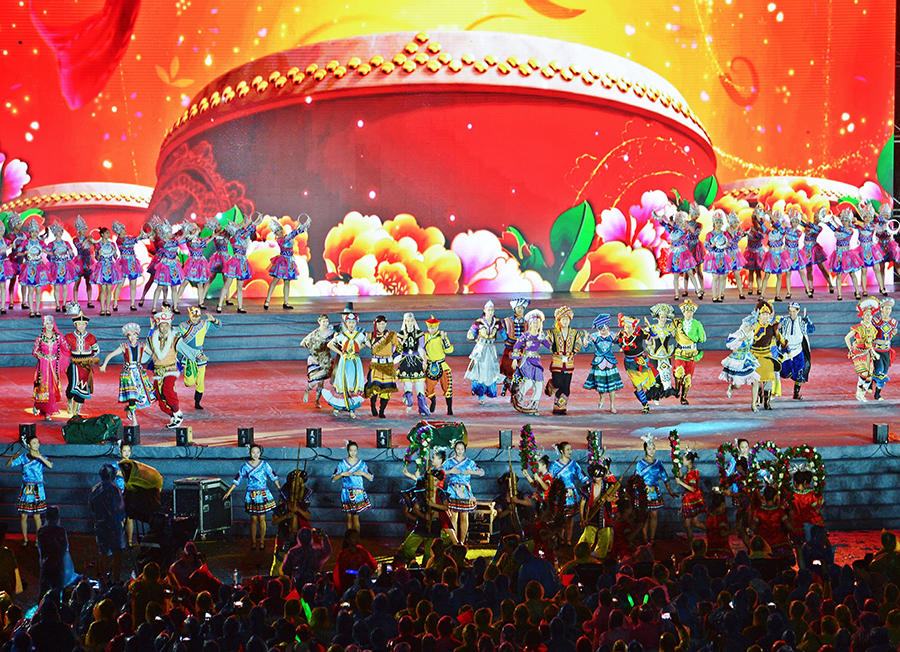 7月8日晚,城步苗族自治县民族文化体育中心,中央民族歌舞团舞剧团演员在表演舞蹈《舞动民族风》。当晚,以“中华一家亲·飞歌城步六月六”为主题的第22届湖南(南山)六月六山歌节开幕式晚会上演。湖南日报记者 徐行 摄