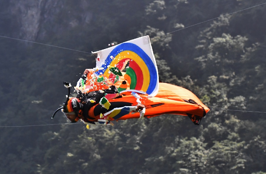 9月4日,参加翼装飞行世锦赛的选手在进行“人箭”穿靶试飞训练。9月5日至8日,第八届翼装飞行世锦赛在张家界市天门山景区举行,来自11个国家的16名全球顶尖翼装飞行运动员,将挑战大回环竞速和“人箭”精准穿靶等项目的比赛。湖南日报记者 郭立亮 通讯员 丁云娟 摄影报道
