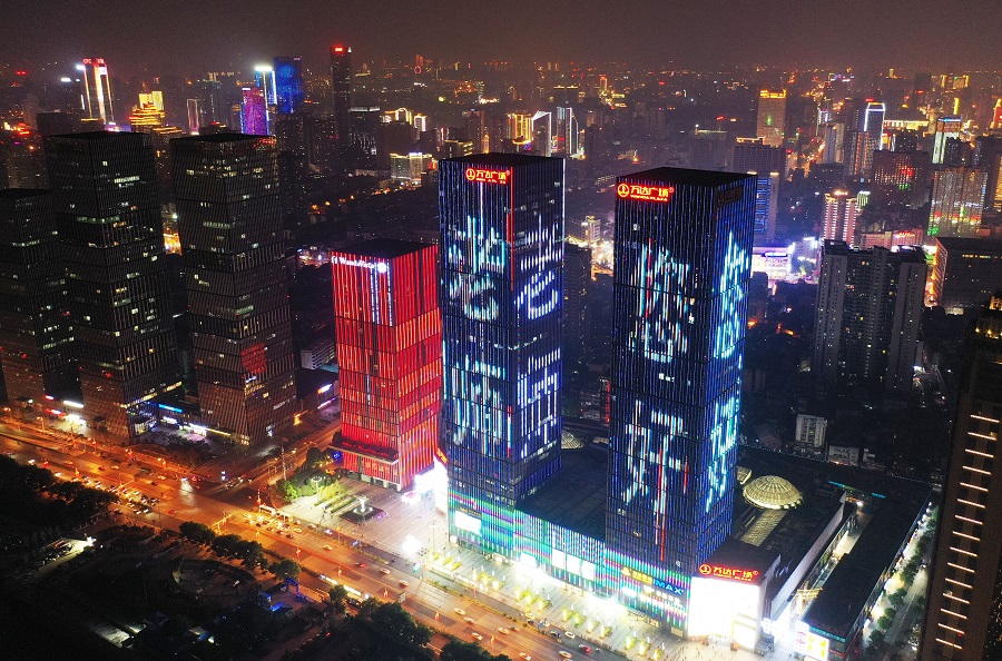 9月9日晚,长沙市开福区万达广场,大楼外墙的LED屏呈现了“老师您好”的字幕。 湖南日报记者 田超 摄