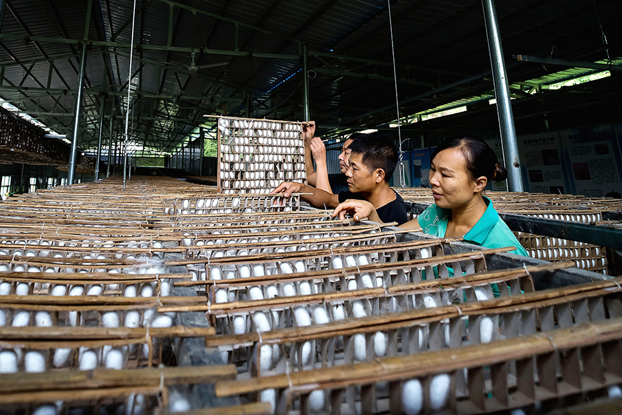 9月10日,通道侗族自治县双江镇生棋村,村干部与驻村工作队员在养蚕房检查蚕茧。今年,该村建立标准蚕房,采取村支两委牵头、驻村工作队监督、镇政府指导的机制,与全村58户241名建档贫困人员建立联结机制,带动全村发展养蚕产业,助力精准脱贫。尹序平 段吉林 摄影报道