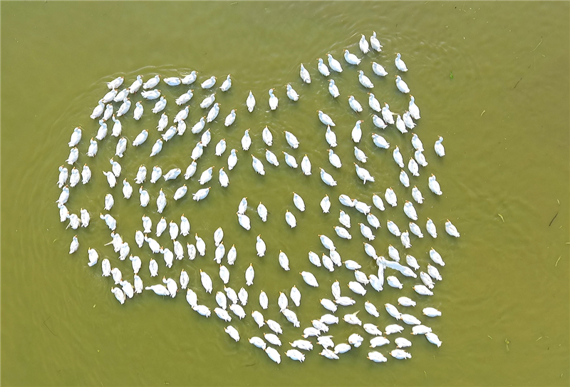 11月20日,双峰县永丰街道同德村九点塘耕读文化产业园,一群大白鹅在游弋觅食。今年,该产业园在流转的九口水塘里实行鹅鱼混养。目前,已出栏大白鹅2000多羽,产鱼5万多公斤,收入近百万元。据统计,同等条件下鱼鹅综合养殖比单项养殖可提高经济收益三成左右。李建新 摄