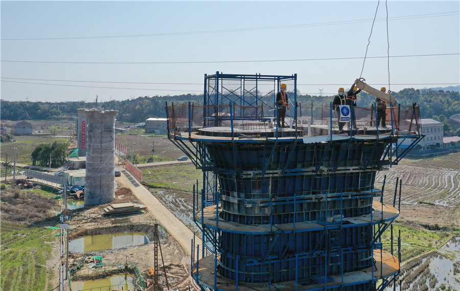 2月18日,由中铁上海工程局施工的常益长铁路益阳绕城高速特大桥工地,工人正在进行墩身施工。该项目管段工程已于近日全线复工,为确保安全健康生产,在做好疫情防控和安全防范工作同时,施工单位科学安排人员有序进场施工,确保安全质量、工程进度。