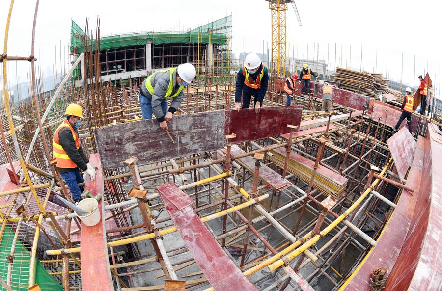 2月25日,岳麓山国家大学科技城核心区——中建智慧谷项目建设现场,施工人员在安装模板。目前,该项目已全面复工。施工单位中建五局三公司免费为项目所有人员进行核酸检测,确保项目建设安全有序推进。湖南日报记者 田超 通讯员 刘真 摄影报道