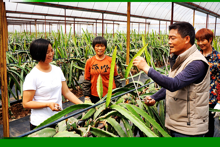 3月23日,宁远县九嶷山瑶族乡舜耕农业产业园火龙果基地,火龙果种植“土专家”张家鸿(右二)为果农传授修剪技术。连日来,宁远县鼓励“土专家”“田秀才”深入田间地头进行技术指导,服务春耕生产。 乐水旺 摄