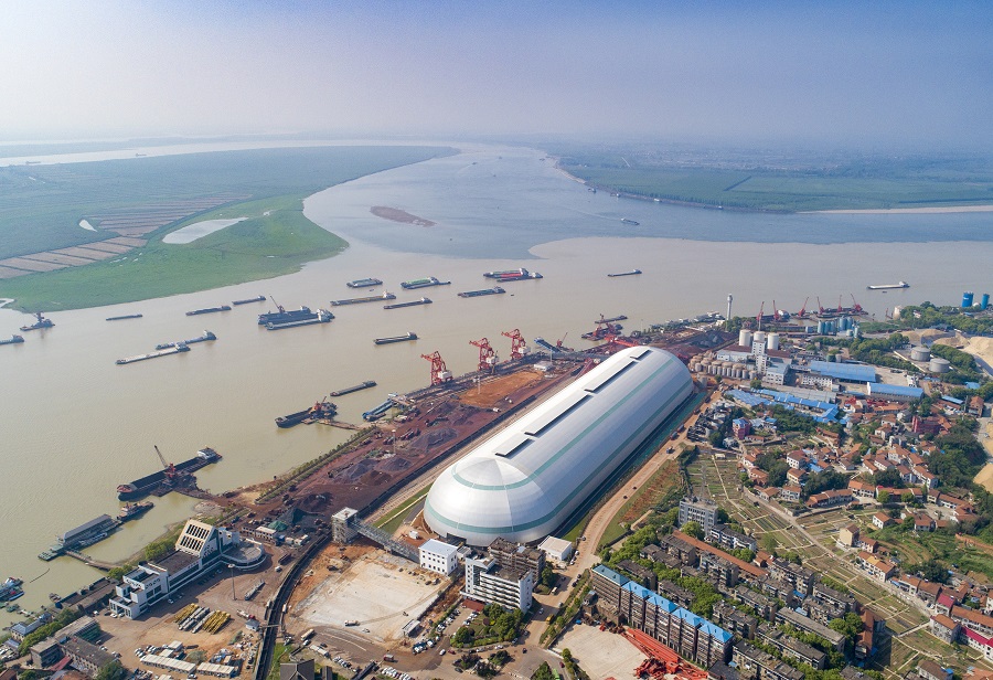 4月12日,岳阳城陵矶港,环保提质改造项目——全封闭“胶囊”散货仓库大棚成功封顶。该项目是省港务集团落实“生态优先,绿色发展”战略,建设的高承载力、高集约化和高效一体化的长江中游内河港口环保提质改造标志性、示范性工程。仓库长470米、宽110米,高46.5米,是目前全省同类型单跨跨径最大、最高的网架结构散货料仓,也是长江流域首个巨型“胶囊”形散货仓库,将于本月底竣工投产。湖南日报记者 徐典波 摄