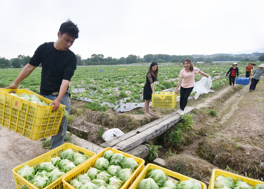 4月20日,嘉禾县晋屏镇下车村,村民抢抓时间采收、包装、外运蔬菜。近年,该村积极发展特色农业产业,规模连片种植各类特色蔬菜600余亩,全部外销到广州、深圳等地。黄春涛 摄