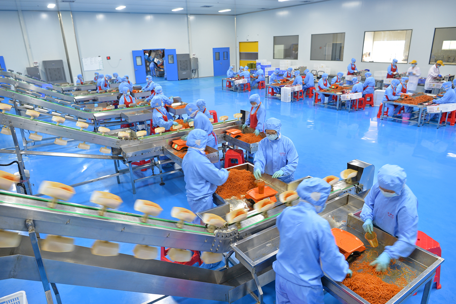 5月25日,汨罗市弼时镇国湘食品有限公司,工人在生产食品。近年,该市实行“易地搬迁 园区就业”的脱贫攻坚模式,开办了24个扶贫车间为易地搬迁户提供就近就业岗位,并通过技能培训、扶持自主创业等形式,让搬迁农户“搬得出、稳得住、能就业、可致富”。李健 摄