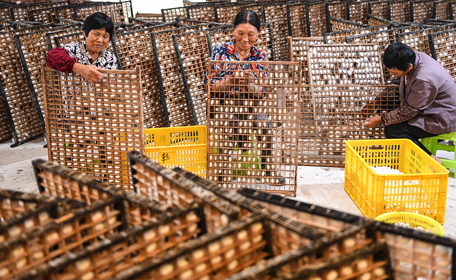 5月30日,道县仙子脚镇蒋家岭村,农民在养蚕大户何炳乾的合作社里摘蚕茧。近年,该村大力发展蚕桑等特色种植养殖和加工产业,带动了当地农民就地就业、增收致富。 蒋克青 摄
