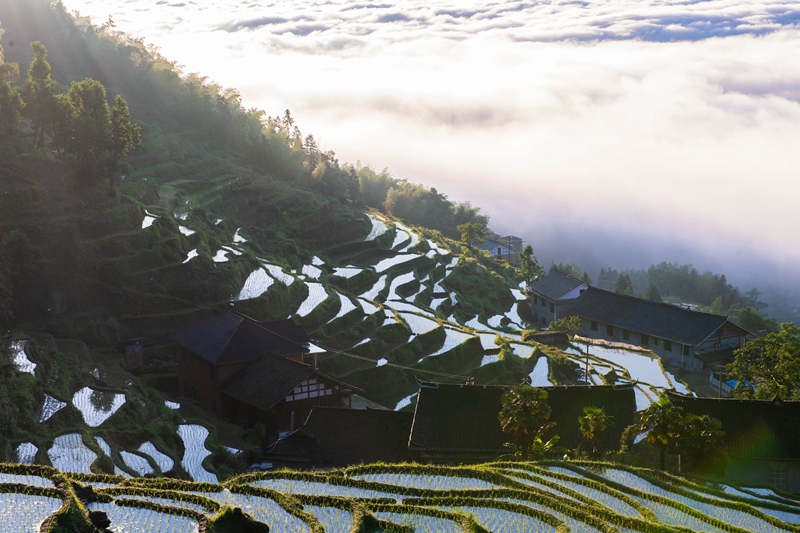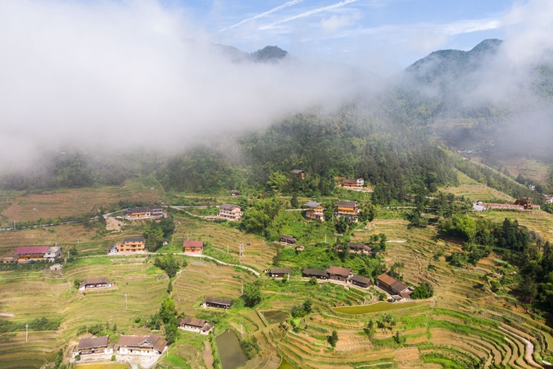 近日,湖南省娄底市新化县水车镇的紫鹊界梯田在雨后云雾缭绕、美如画卷。