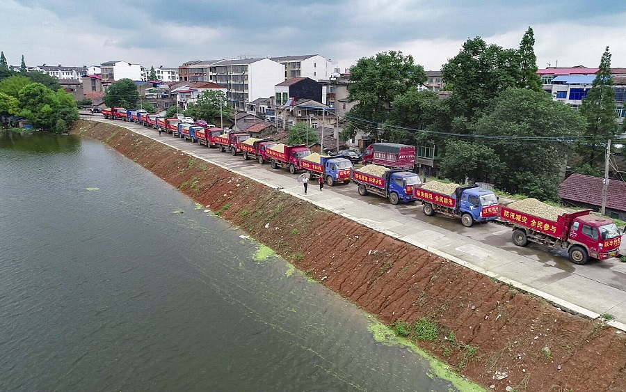 7月11日,华容县华容河潘华大桥西侧大堤上,“以车代仓”应急抢险车队严阵以待。为了有效提升全域防汛应急抢险工作能效,该县从去年开始试行“车船代仓”新模式,将以往定点储存的防汛物资装船上车,提升了调运机动性。湖南日报记者 徐典波 通讯员 吴巍伟 摄影报道