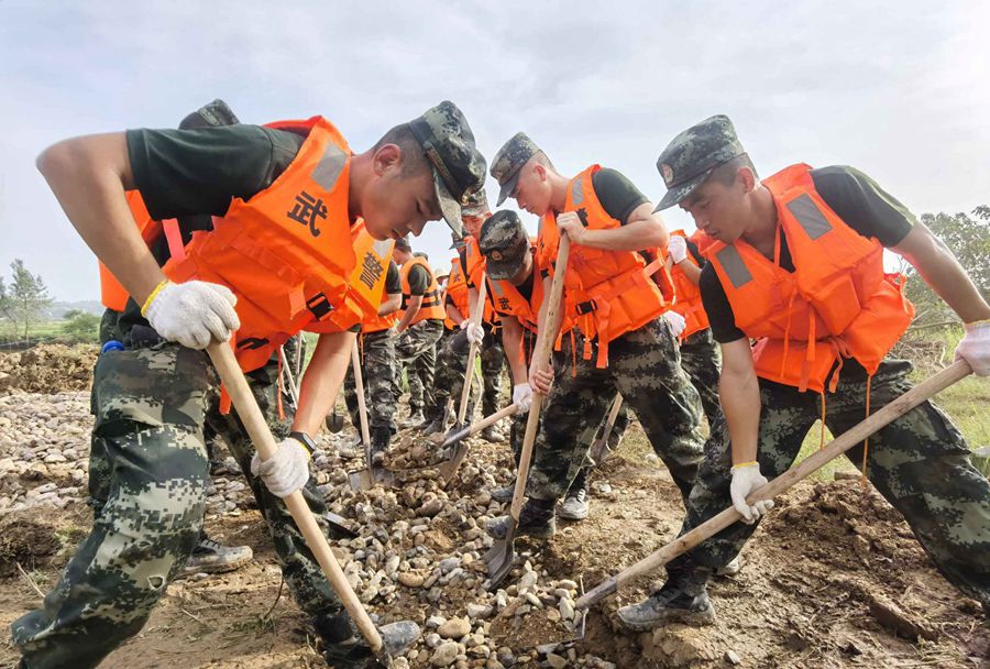 7月24日下午,岳阳县荣家湾镇六合垸废穴氹堤段,武警官兵正在抢险。当天16时20分,该堤段导浸沟内突现直径约10厘米的水柱。经现场水利人员勘测确定为废弃压水井管涌险情。现场武警官兵立即投入抢险,在技术人员指导下挖开导浸沟将水引流,然后用砂卵石进行回填。经过4个小时奋战,险情被成功处置。徐典波 杨迅骞 摄