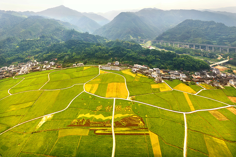 9月2日,溆浦县北斗溪镇坪溪村,稻田创意图案“乡村振兴”与青山、民居辉映成景。近年,该镇加快推进特色文旅小镇建设,助推乡村振兴。 湖南日报首席记者 郭立亮 摄