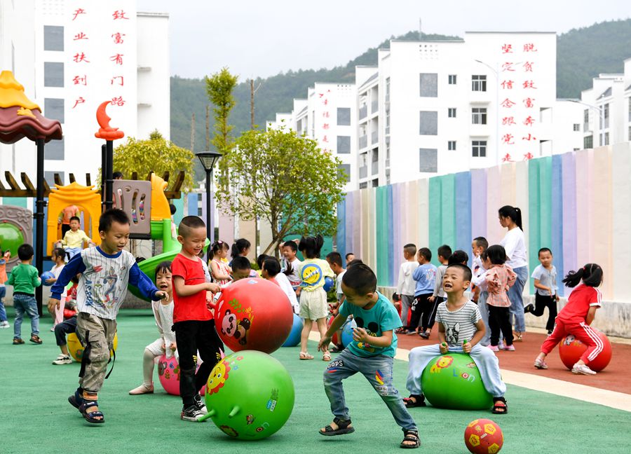 9月7日,桂东县沙田镇大水村易地扶贫搬迁安置点,小朋友在幼儿园内玩耍。该幼儿园位于安置点内,可容纳240名小朋友就读。