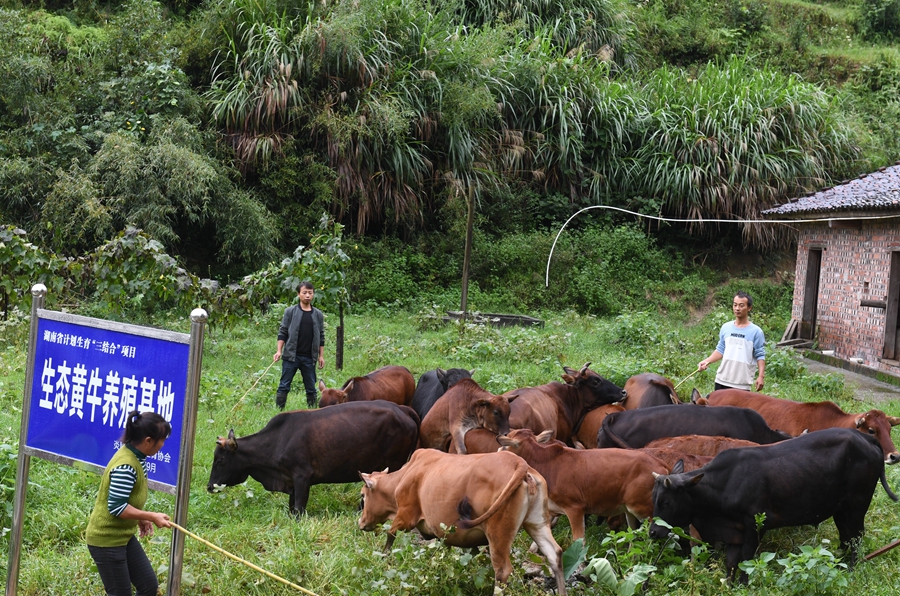 9月28日,炎陵县鹿原镇金紫峰村养牛大户董堂明(右一)在生态黄牛养殖基地放牛。