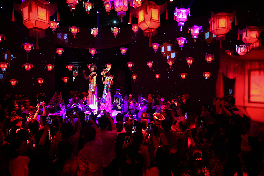 10月3日,隆回县虎形山瑶族乡大花瑶景区,演员在表演《花瑶喜宴》。中秋国庆长假期间,该景区打造的情景剧《花瑶喜宴》,吸引了众多游客前来体验花瑶民俗文化。 曾勇 摄