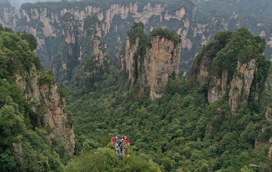 10月5日,游客在张家界国家森林公园黄石寨景区游玩。国庆中秋长假,该景区迎来众多游客。人们走近世界自然遗产,饱览张家界地貌峰林景观,乐享假期好时光。 吴勇兵 摄