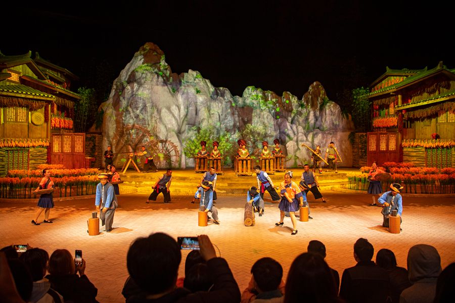 夜幕降临,情景大戏“竹山花开”在村中剧院上演。这部今年国庆期间全新推出的舞台剧,由43位村民本色出演,在舞台上勾勒出一幅生动的“四季农耕图”。现场,游客们掌声连连。“以前都是我们看别人的热闹,现在是别人来看我们的热闹哩!”在剧中表演抛秧苗、筛稻谷的吴芳开心地说。