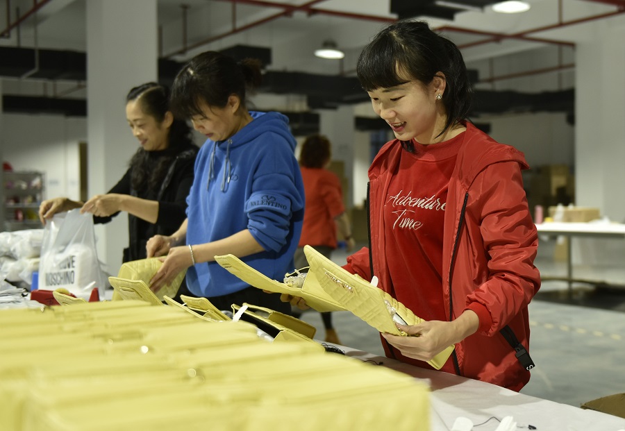 10月29日,蓝山县皮具箱包科技产业园嘉益皮具有限公司,工人在赶制一批出口意大利的皮具箱包。近年来,该县抢抓机遇发展皮具箱包产业,签约引进皮具箱包企业70多家,已投产50多家,解决劳动力就业4000余人。杨雄春 摄