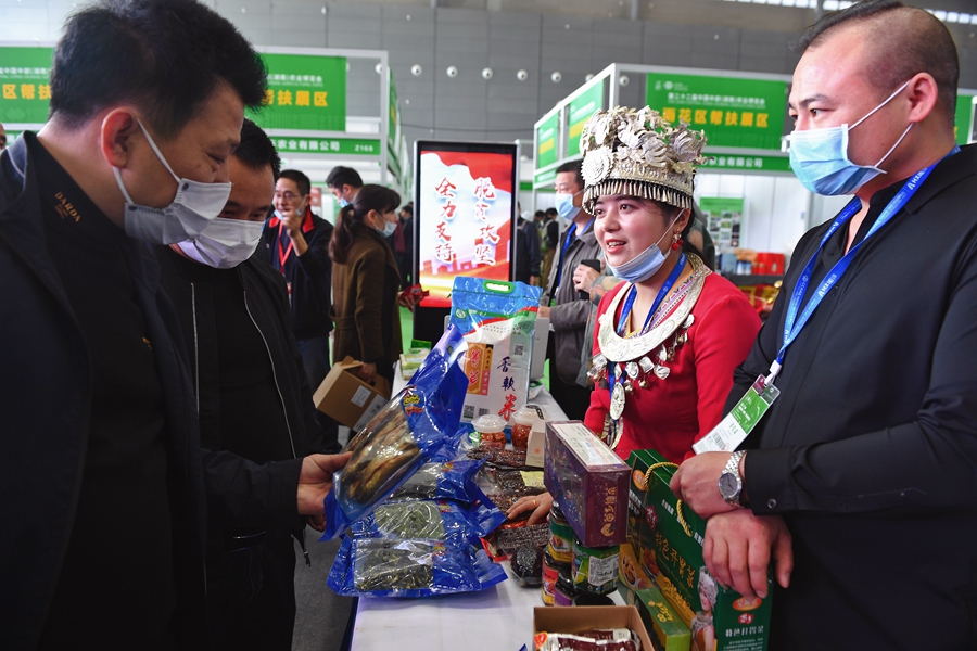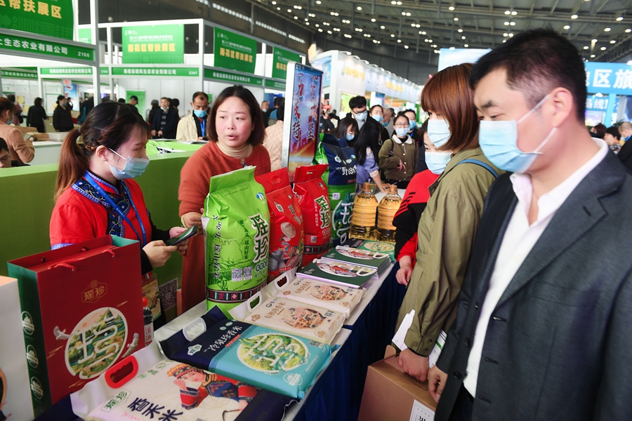 11月2日,长沙国际会展中心,消费者在农博会832扶贫专场采购订货会上选购湘西苗家“土特产”。