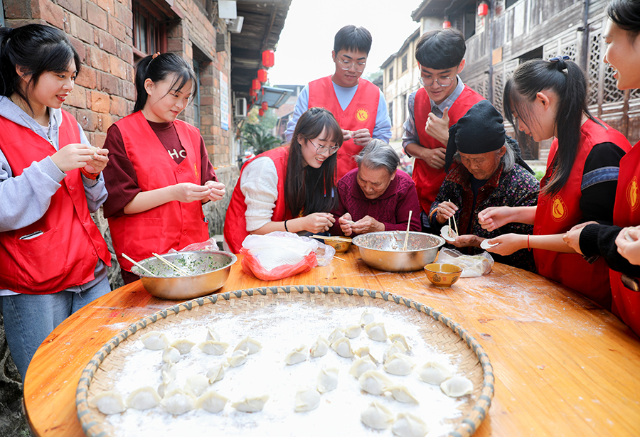 11月5日,永州市零陵区柳子街,大学生志愿者和老人一起包饺子。当天,湖南科技学院人文与社会科学学院的青年志愿者走进柳子街开展志愿服务活动,丰富老人的生活。33年来,该院志愿者每周都来到老街,关爱独居老人。 李谌涵 刘晨 摄影报道