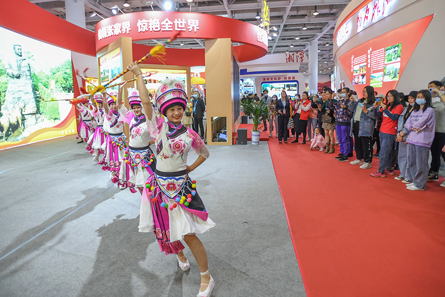 11月15日,湖南国际会展中心,张家界展区精彩的桑植白族仗鼓舞表演吸引了众多观众。当天是2020中国红色旅游博览会第二天,不少市民来到博览会现场探寻红色足迹,接受爱国主义教育。 湖南日报记者 辜鹏博 摄