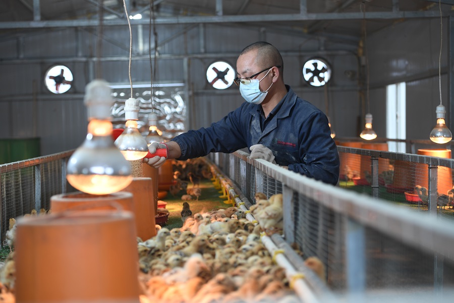 12月10日,衡南县洪山镇鑫鸿生态农业有限公司平养育雏室,饲养员给湘黄鸡鸡苗喂食。湘黄鸡是衡南地方优质鸡品种,近年来,该县大力发展湘黄鸡养殖产业,实现从传统养殖向现代化养殖方式转变,年出栏已突破1100万羽,产值达7亿元。湖南日报记者 田超 通讯员 肖力元 摄影报道