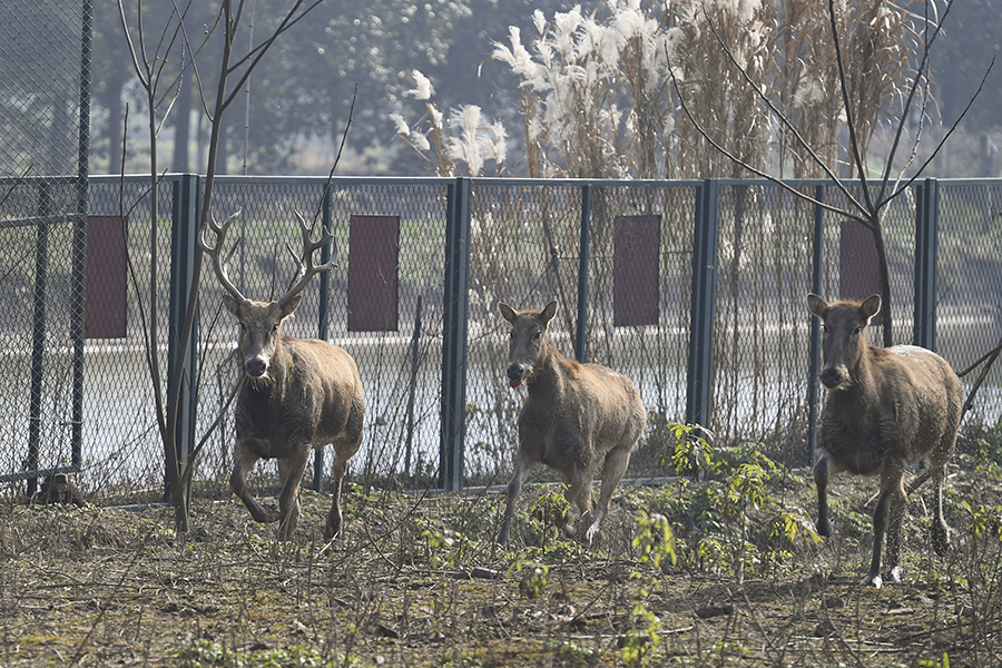 12月22日,3头麋鹿在沅江市合兴洲麋鹿救助点里奔跑。当天,沅江市林业局工作人员在漉湖芦苇场放生3头伤愈麋鹿。目前,洞庭湖区麋鹿种群数量达到了210多头。 湖南日报记者 辜鹏博 通讯员 楚峰 摄影报道