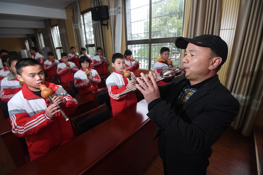 12月23日,衡山县开云镇中心学校,学生在文化志愿者的指导下,学习葫芦丝演奏。近年来,该县积极推进民族乐器产业发展,以生产葫芦丝、竹笛、二胡为主的民族乐器产业初具规模,全县共有相关企业80余家,年生产乐器100万支。县民族乐器制作协会积极开展民族乐器进课堂活动,加强中国民族器乐文化的传承和普及。