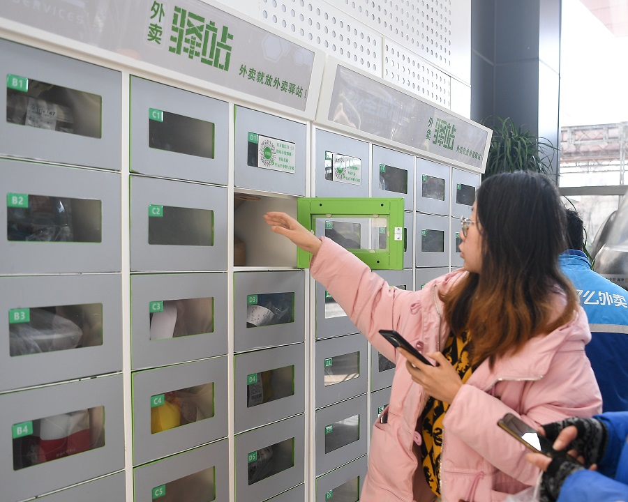 1月11日,长沙市天心区某写字楼,市民在外卖智能取餐柜前取餐。随着气温降低,长沙不少写字楼里的智能取餐柜使用率逐渐提高,该取餐柜不仅可以实现外卖“无接触配送”,还能为外卖保温,在保障疫情防控的同时提升市民用餐质量。湖南日报·新湖南客户端记者 傅聪 摄