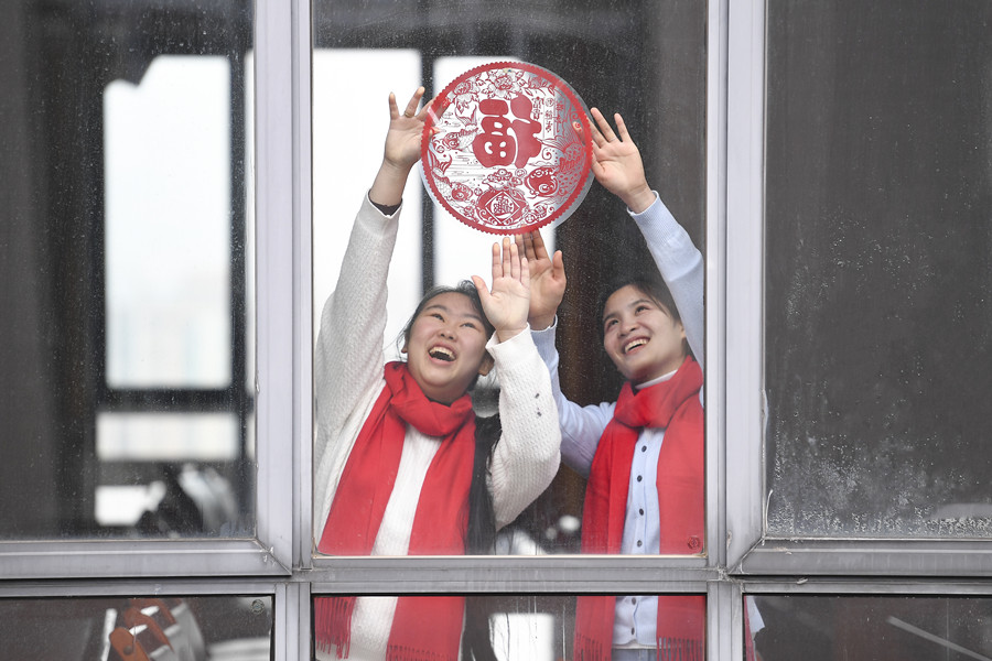2月5日,长沙民政职业技术学院,来自老挝的留学生缇达盼(左)和潘桑达在宿舍贴窗花。因疫情原因,她们留在中国过春节。学校积极做好防疫物资和必要生活物资供应,让她们感受到家的温暖。辜鹏博 陈彦妤 摄影报道