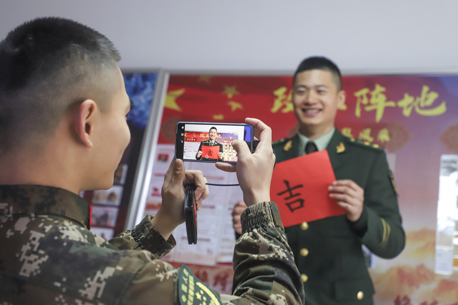 2月10日,武警湖南总队机动支队官兵为家人录制祝福视频。该队原本准备休假官兵,纷纷响应号召,就地过年。辜鹏博 冯太保 摄影报道