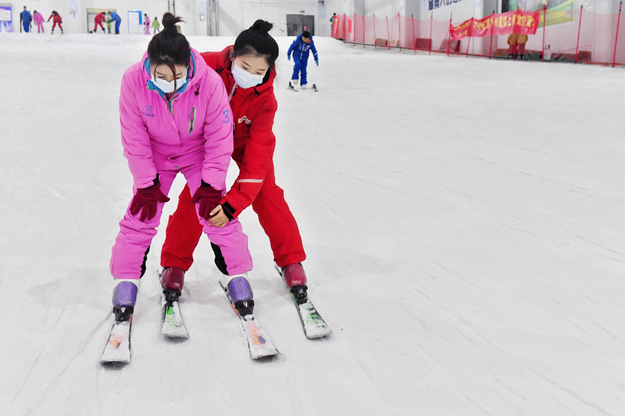 2月7日,黑龙江省牡丹江市女孩吴心雨(右)在指导市民学习滑雪。19岁的她在长沙三只熊冰雪王国担任专业滑雪教练已有2年。今年,她主动提出留在单位过春节。徐行 摄