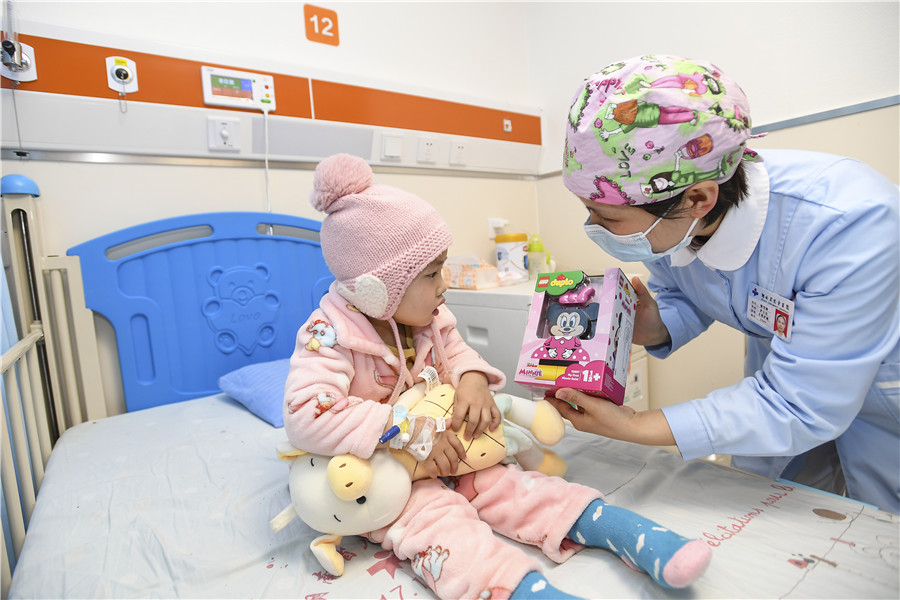 2月8日,湖南省儿童医院,神经外科护士长陈学娣给小患者送新年礼物和祝福。今年春节,该院所有医护人员留在长沙过年。辜鹏博 李奇 摄影报道