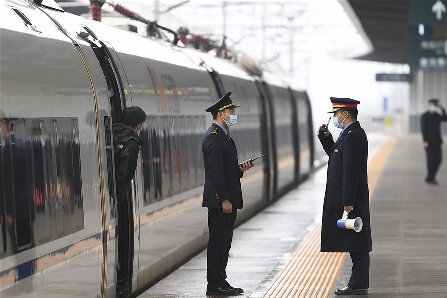 2月11日,大年三十,高铁娄底南站,站台客运员周楚傑(右)和G6402次列车列车长交接。26岁的周楚傑是岳阳人,这是他第4年在外地过年。为响应国家“就地过年”的号召,该站家在异地的员工纷纷选择留守在车站过年。辜鹏博 黄清海 摄影报道
