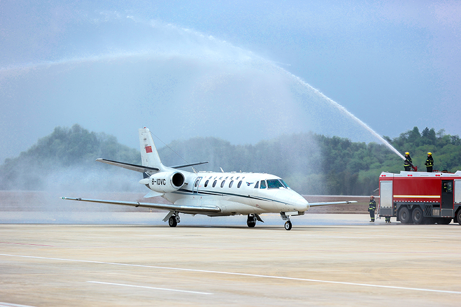 3月22日下午,郴州北湖机场举行“过水门”仪式,迎接首架校验飞机,标志着该机场正式进入校飞阶段。机场总投资21.3亿元,航站区按满足2025年旅客吞吐量55万人次、货邮吞吐量3000吨、飞机起降量7300架次的目标设计,计划今年7月通航。 欧阳常海 摄