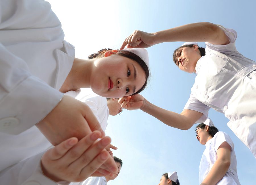 5月9日,南华大学广场,妈妈凌桂秀(右一)应邀给女儿、南华大学护理学院2021届毕业生唐恬(左一)授护士帽。当天,南华大学2021届护理学院毕业生“授帽”宣誓仪式举行,共有198名护理专业的应届毕业生接受“授帽”,宣誓成为一名真正的“白衣天使”,以此迎接即将到来的“5·12国际护士节”。 曹正平 夏代会 摄影报道