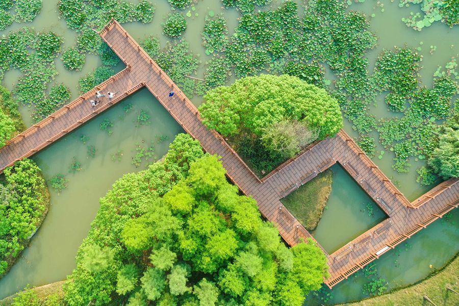 6月8日,道县绍基公园,市民在步道上散步。近年,该县对县城边荒塘草地进行生态修复,充分利用原有地形、植被、水体和洼地,在绿化的同时突出花化和彩化,昔日的荒草地变身生态公园,成为人们休闲健身的好去处。蒋克青 摄