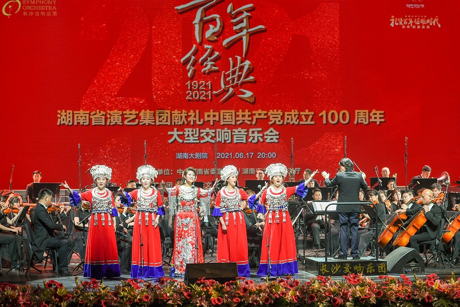 6月17日,女声小组唱《映山红》正在上演。当晚,由中共湖南省委宣传部、省文化和旅游厅指导,省演艺集团、湖南中华文化促进会主办的“百年经典”湖南省演艺集团献礼中国共产党成立100周年大型交响音乐会在湖南大剧院举行。湖南日报·新湖南客户端记者 傅聪 龙文泱 摄影报道