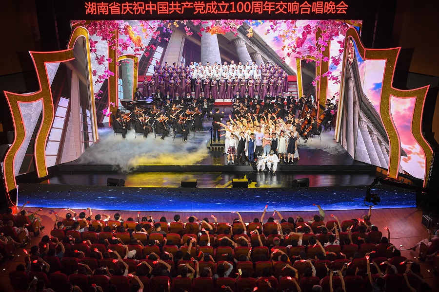 6月29日晚,表演者在表演《灯火里的中国》。当晚,“唱支山歌给党听”湖南省庆祝中国共产党成立100周年大型交响合唱晚会在湖南大剧院举行。湖南日报·新湖南客户端记者 傅聪 龙文泱 摄影报道