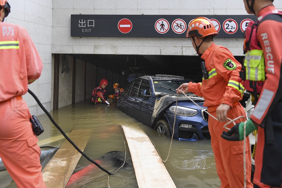 7月23日,河南省郑州市金水区王新街瀚海晴宇小区,湖南省应急(消防)救援机动支队消防指战员在地下车库进行排涝工作。