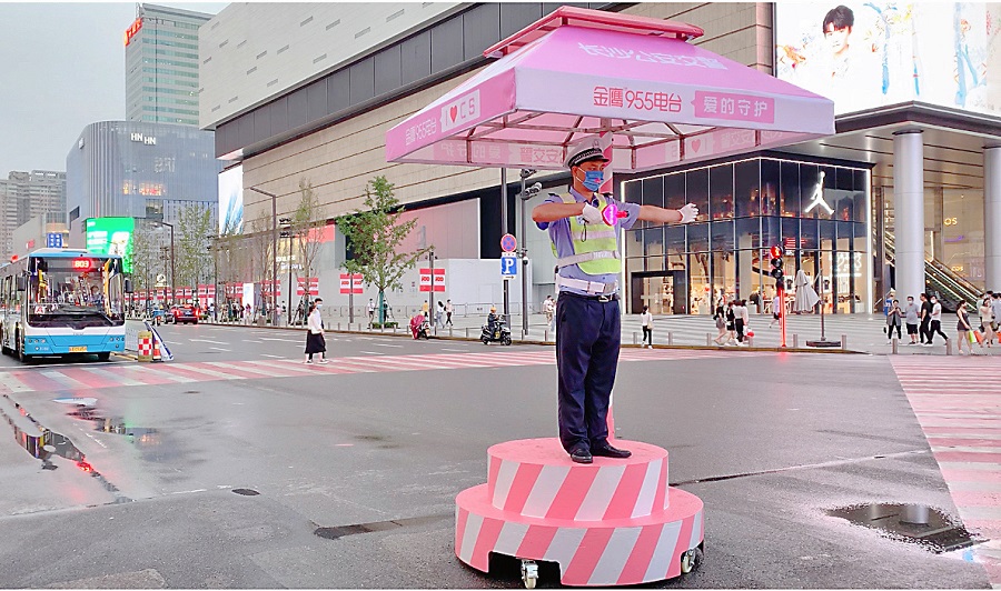 8月13日下午,长沙黄兴南路步行街路口,城区首个粉红交警执勤岗台亮相,交警拿着爱心形状的指挥棒在指挥交通。中国传统节日七夕节,长沙交警为市民送上节日的祝福。照片均为湖南日报·新湖南客户端记者 徐行 摄