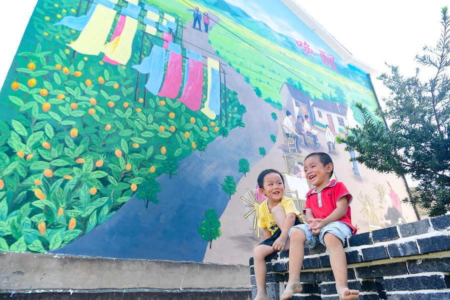 8月29日,浏阳市北盛镇卓然村,小朋友们在墙画下玩耍。今年,该镇全域实施美丽宜居村庄建设行动,涉及10个村、18个自然屋场,农村人居环境高质量得到提升。彭红霞 摄