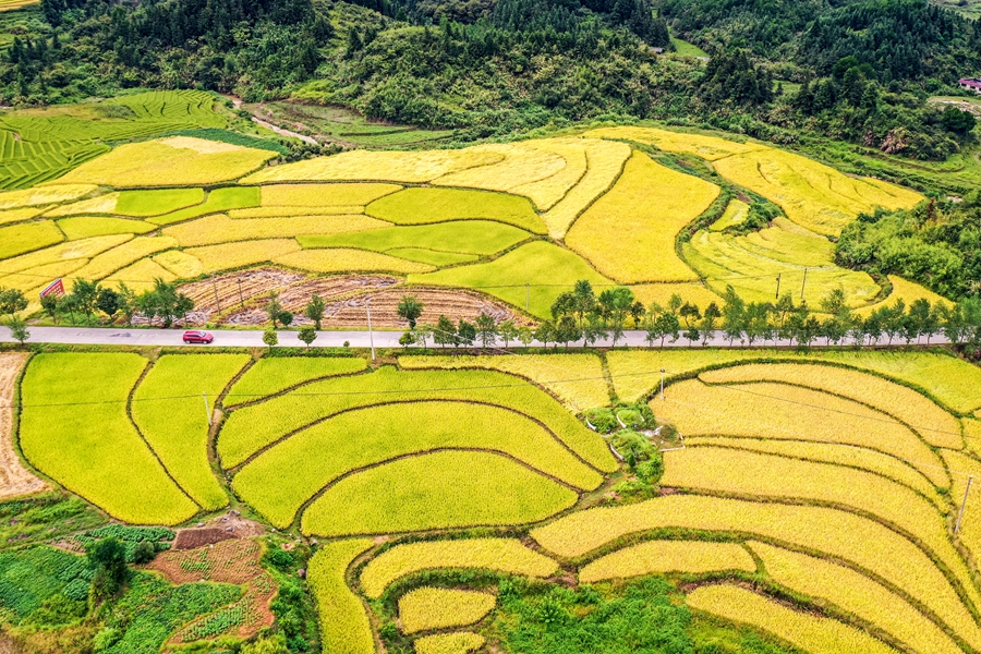 9月7日,蓝山县所城镇新山田村,车辆在乡道上行驶,沿途的稻田翻着金浪,好一幅秋日田园画卷。彭华 摄
