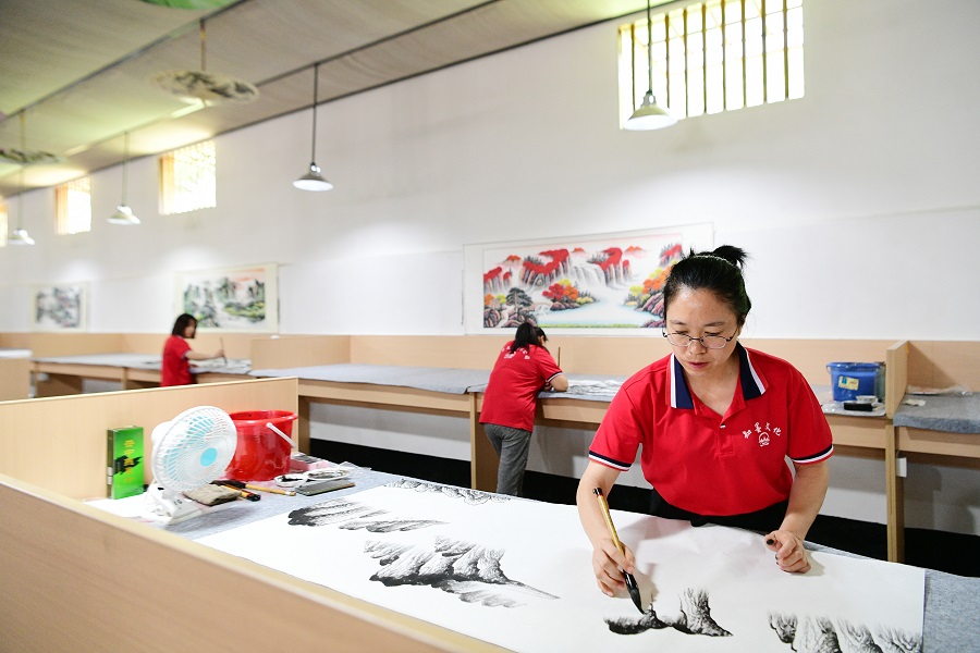 9月9日,浏阳市小河乡新河村知墨画室,村民正在画国画。近年来,该乡着力打造集写生、创作、展示、交易、培训、旅游为一体的艺术产业基地集群区,带动村民增收。目前,该乡有6个村级画室,460余名“农民画师”实现家门口就业,绘画作品远销韩国、日本、新加坡等海外市场。彭红霞 摄