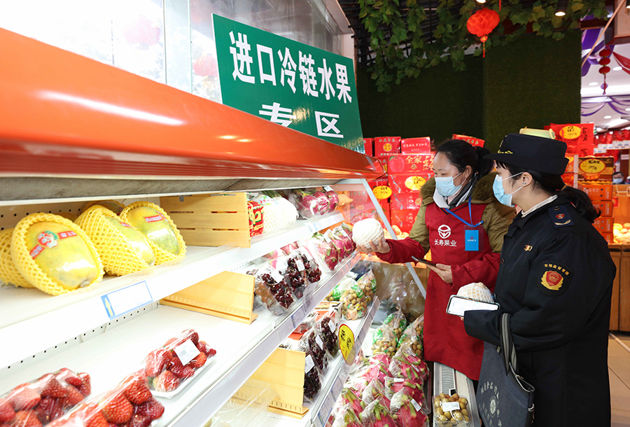 1月24日,张家界市武陵源区市场监督管理局工作人员在超市内检查食品安全。春节临近,该区加大对市场肉类、蔬菜、米面、蛋奶等生活物资储备和供应力度。同时,重点加强冷链食品、进口水果等日常市场监管,切实保障人民群众“菜篮子”充足和安全。 吴勇兵 摄