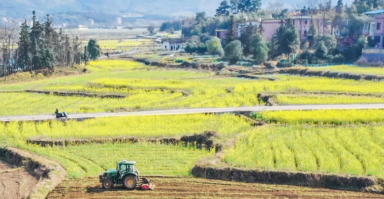 3月10日,蓝山县塔峰镇六七甲村,村民驾驶农机在翻耕土地。春耕农忙时节,当地农民抢抓农时开展春耕生产,田间地头机声隆隆,一派人勤春早的忙碌景象。彭华 摄