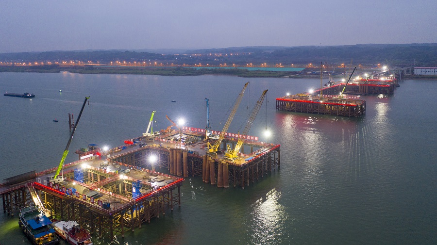 3月24日傍晚,长沙暮坪湘江特大桥项目施工现场一派繁忙。该项目一手抓防疫,一手抓生产,近200名工人奋战一线,开展水下施工。湖南日报全媒体记者 辜鹏博 摄