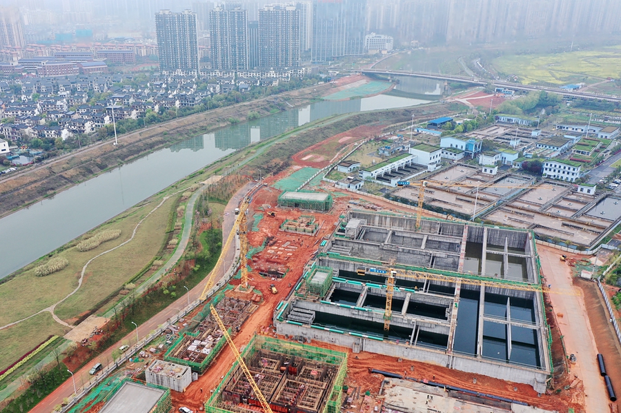 3月25日,长沙市岳麓区靳江河东岸,洋湖再生水厂三期项目建设如火如荼。该项目预计在2023年初投入试运营,届时可为靳江河每日最高增加10万吨生态补水。湖南日报全媒体记者 徐行 摄